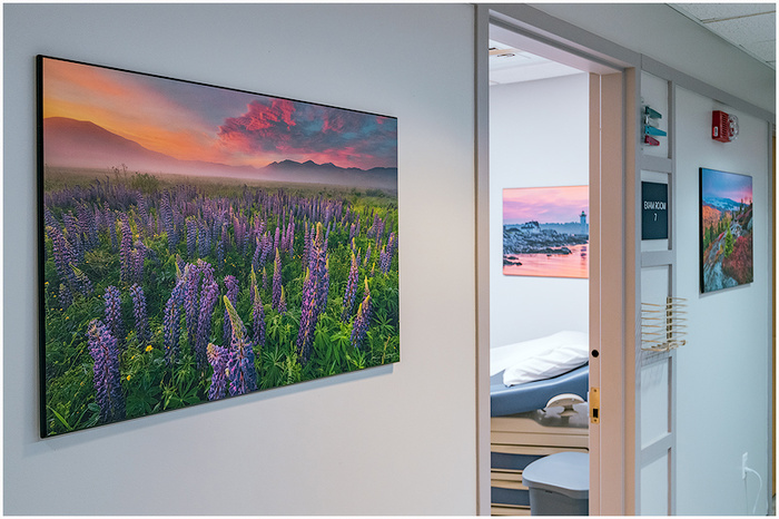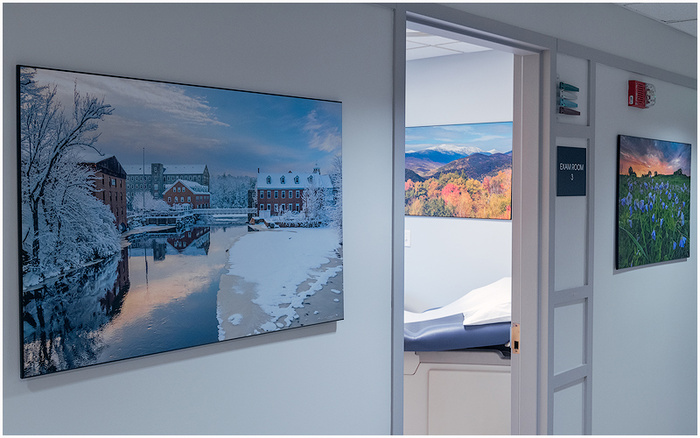 Portsmouth Cardiology Associates / Appledore Medical Group of Portsmouth recently renovated new office space in Portsmouth, NH. As part of their renovation, 20 Atriplaq Photographic Prints were selected to enhance the visual interest of the new medical space. Artiplaq Prints are mounted on a wooden substrate with a UV anti-glare protective coating that work well in a medical environment. This frame and glass free option allows larger print size with a modern look without the hazard of glass breakage. Artiplaq Prints can be made up to 8 feet wide and give an impressive look at any size. Feel free to contact me to discuss your project incorporating Artiplaq, Metal, Canvas, or traditional Framed prints.