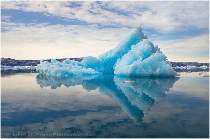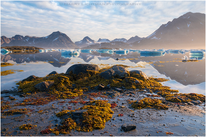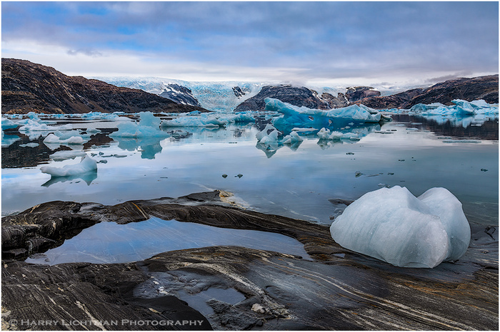 Greenland is a wild place, where ice river inlets connect to the North Atlantic. Not much green to report, mostly ice covered igneous rocky shorelines with the Greenland Icecap creeping toward the water's edge. I encountered all types of weather during my short stay. Brief periods of clearing sandwiched between rain, thick fog, and even some high elevation snow. Seas were generally calm, with long periods of profound stillness that made for some great photo opportunities. Many whales were spotted, just not in photogenic conditions so I just enjoyed them without taking photos. My Iceland images are probably more exciting to view, as the incredible vastness, emptiness, and harshness of the Greenland landscape was a challenge to convey in photos. With little direct sun, sunrises and sunsets were generally muted at best. Chances of Polar Bear encounters were slim, but safety concerns limited my ability and freedom to roam for compositions as I am usually accustomed to.